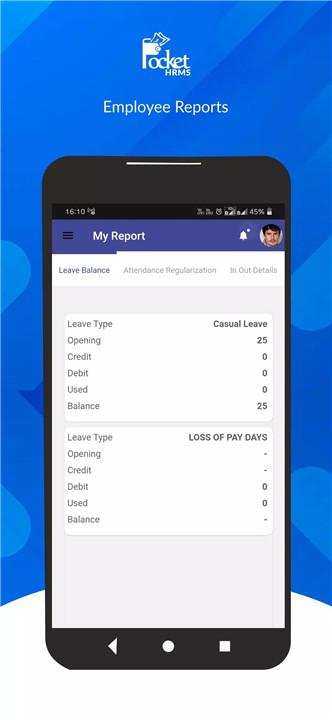 Apply for leave, view transaction reports, and mark attendance remotely with geotracking.