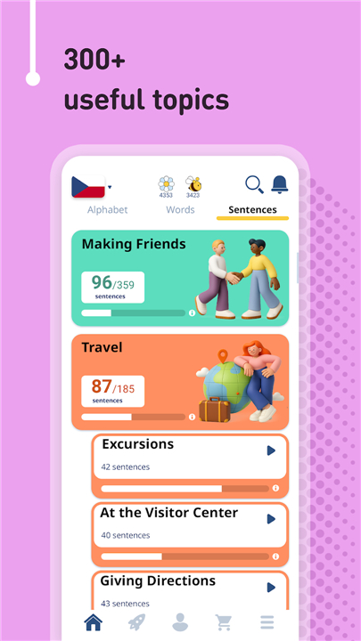 • Vocabulary: Over 6,000 of the most useful Czech nouns, verbs, adjectives, and more, arranged in 7 difficulty levels and 200 everyday topics.