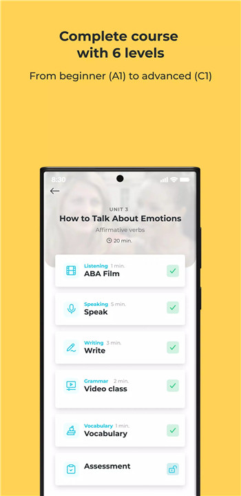 Complete English Course: Dive into a video-based course consisting of 144 units across 6 official levels, from Beginner (A1) to Business (C1). Each unit starts with an ABA Film, immersing you in everyday English conversations with native accents and subtitles in your language.