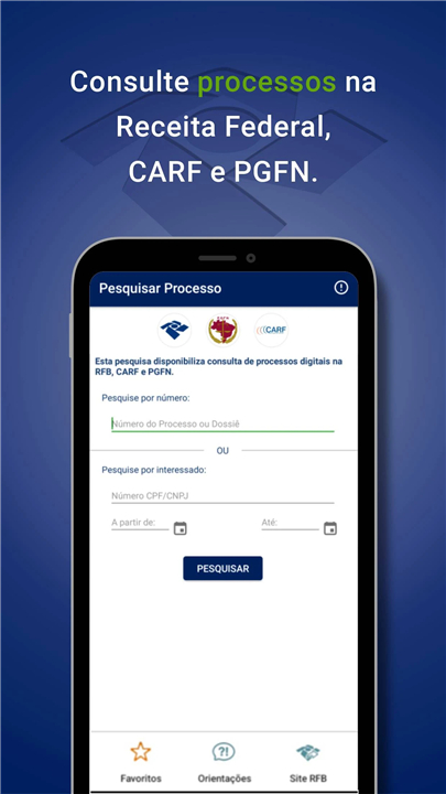 Consult and monitor processes at the Federal Revenue, CARF and PGFN Download the latest version of e-Processo to enjoy new features and updates immediately!