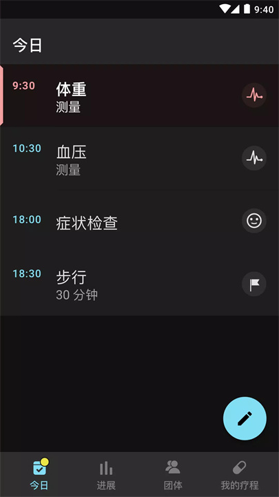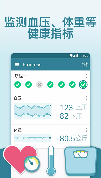 MyTherapy支持记录多种健康指标,如体重、血糖、血压、体温、心率等。用户可以通过记录这些数据,随时了解自身健康状况,监测疾病发展或疗效。