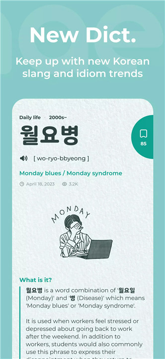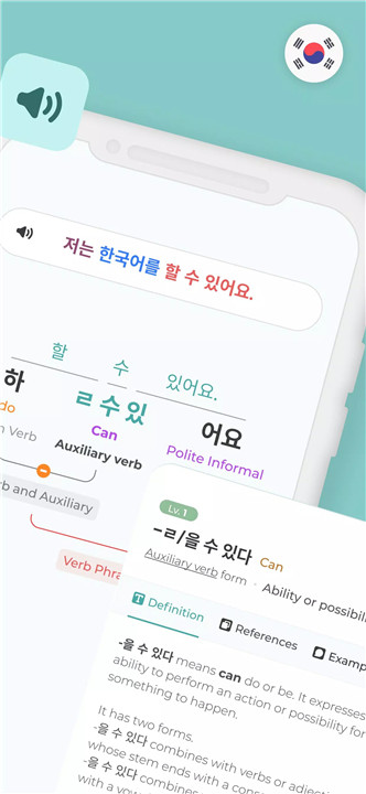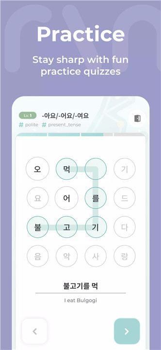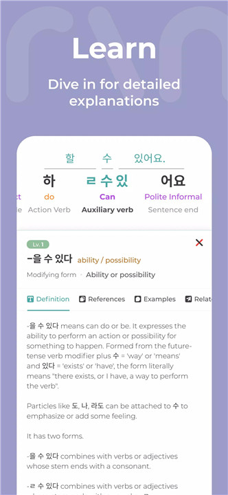 Mirinae features a built-in dictionary and searchable grammar reference, making it a valuable tool for enhancing your understanding of Korean vocabulary, grammar, idioms, and neologisms. Access a vast library of idiomatic expressions and newly coined words essential for understanding modern spoken Korean, K-pop lyrics, and K-drama dialogue.