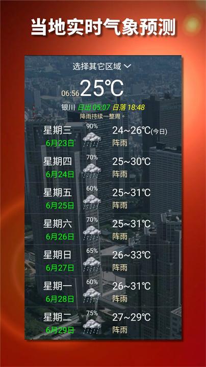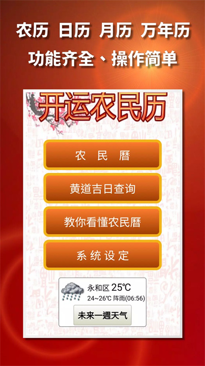 除了农历内容,还提供未来一周的本地天气预报,让用户不仅能查看日历,还能提前了解天气变化,为日常生活提供更多便利。