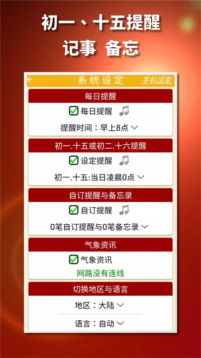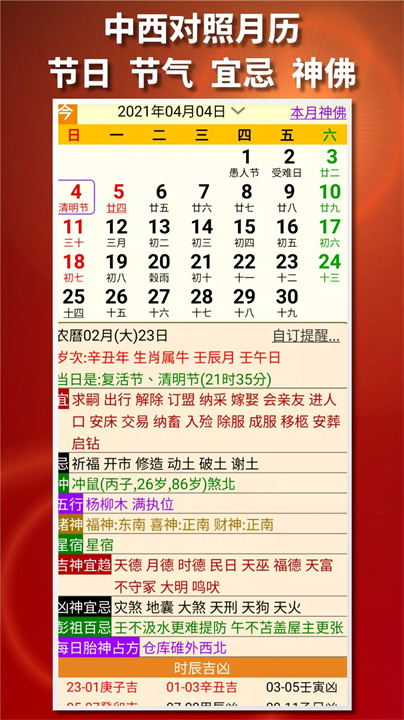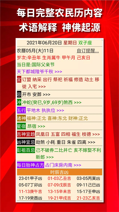 该应用包含每日农民历的详细内容,覆盖了节气、节日、宜忌事项、冲煞信息等内容,同时包含吉神、凶神、五行属性、彭祖百忌、胎神占位等丰富的信息。同时还为用户提供每日提醒功能,确保重要信息不被错过。