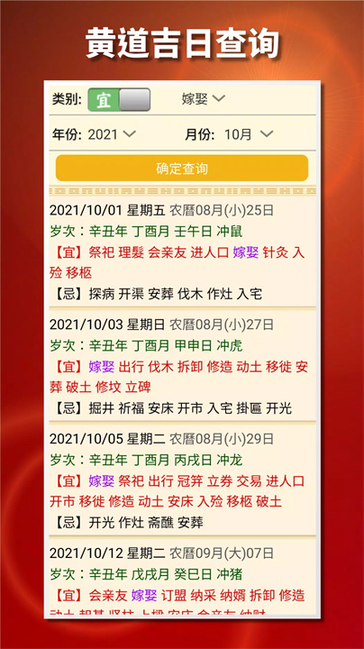 提供简便的吉日查询功能,用户可以根据特定事项(如嫁娶、开市、搬迁等)选择查询日期范围,快速找到合适的黄道吉日,非常适合需要择日的用户。