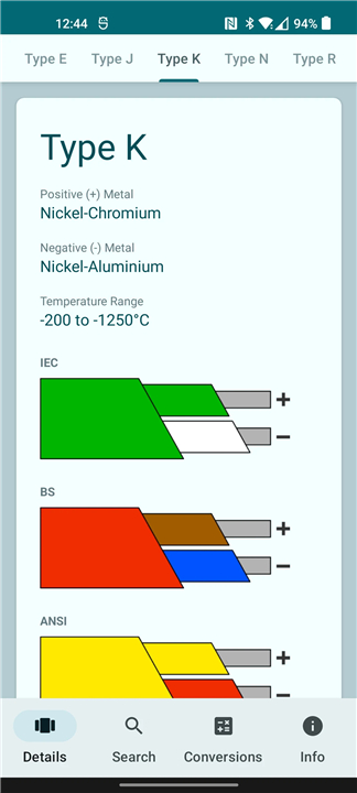 A: Unlike most reference apps, Thermocouples is fully open-source, free to use, and built with user privacy in mind. It combines international colour code standards, material data, and precision conversions in a clean, modern interface, backed by community-driven development.