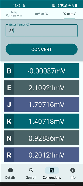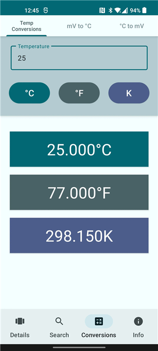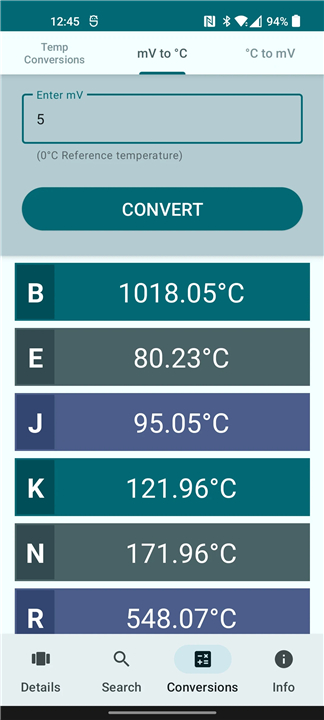 • From version 1.1, the app can convert millivolts (mV) to degrees Celsius (°C) using NIST reference data, ensuring high-precision readings (based on a 0 °C reference).