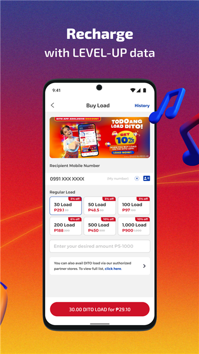 • Buy regular load or high-speed data promos and pay via debit/credit cards or popular e-wallets like GCash, GrabPay, Maya, ShopeePay, or WeChat — even DITO Points.