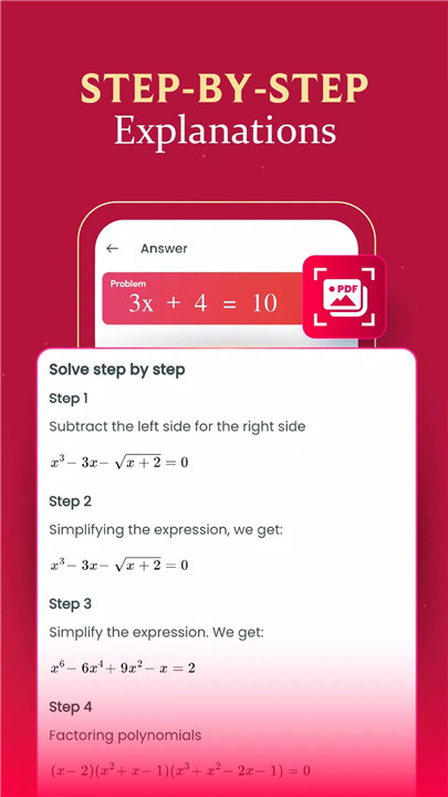 - Scan PDFs: Capture math problem sets from printed materials using your device's camera and convert them into a digital format for solving.