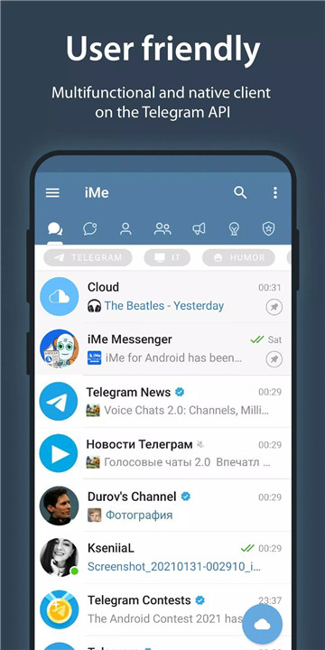 Enhancing communication, iMe supports up to 5 accounts with features such as chat grouping via topics and folders, customizable tabs and FAB-buttons, and automatic sorting including archiving. Private cloud albums and consolidated music playback from chats and devices further streamline user interaction.