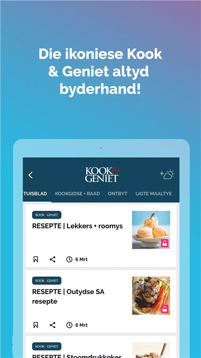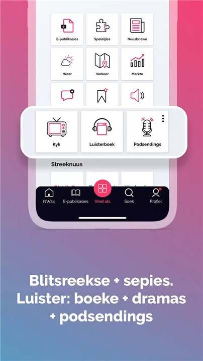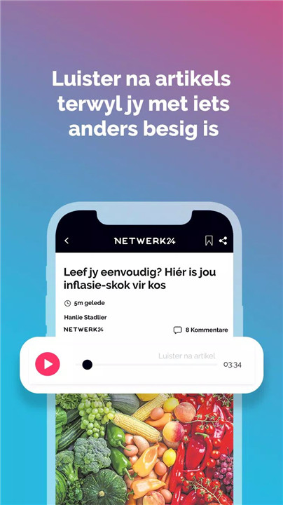 Enjoy listening to articles while multitasking with our text-to-voice feature, or dive into our range of audio books and podcasts. Whether you're cooking, commuting, or exercising, you can stay informed without having to read. You can also enjoy short video soapies and Kook & geniet recipes for added entertainment and inspiration.