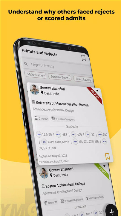Knowing your chances of admission can give you a huge edge. YMGrad offers access to 5,000+ Admits and Rejects, updated daily. You can filter these decisions by: