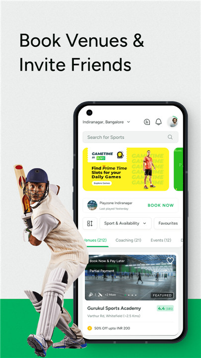 Cricket, Badminton, Football, Hockey, Swimming, Volleyball, Tennis, Table Tennis, Basketball, Rugby, Kabaddi, Squash, Paddle Tennis, Yoga, Workouts, Running, Cycling, Adventure Sports, Trekking, Golf, Zumba, Aerobics, Gyms, Snooker, Pool, Billiards, Skating, Paintball, Bowling, Motor Sports, Go Karting, Mixed Martial Arts, Kickboxing, Taekwondo, Kungfu, Boxing, Bubble Football, Soapy Football.