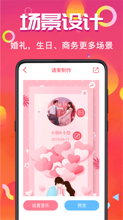 提供大量背景音乐、照片、边框、字体等素材,用户可以自由搭配,打造充满创意和特色的电子请帖。