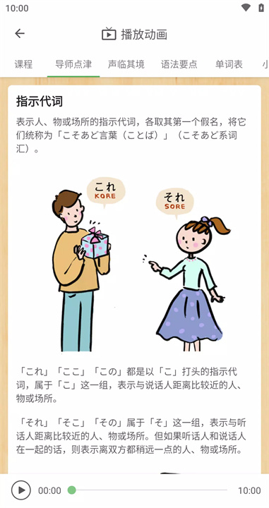 为了帮助学习者更好地掌握日语发音,[简明日语]提供了由母语为日语的讲师录制的标准发音。通过反复聆听和模仿,用户可以逐步改善自己的发音,并且能够掌握日语特有的语调与节奏,避免常见的发音错误。这一点对于日语学习者来说至关重要,尤其是在日常交流中,正确的发音可以避免误解,提升语言表达的自然度和流利度。