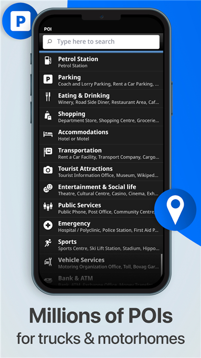 • Thousands of verified POIs: truck stops, weigh stations, parking, campsites, hotels, restaurants