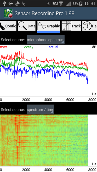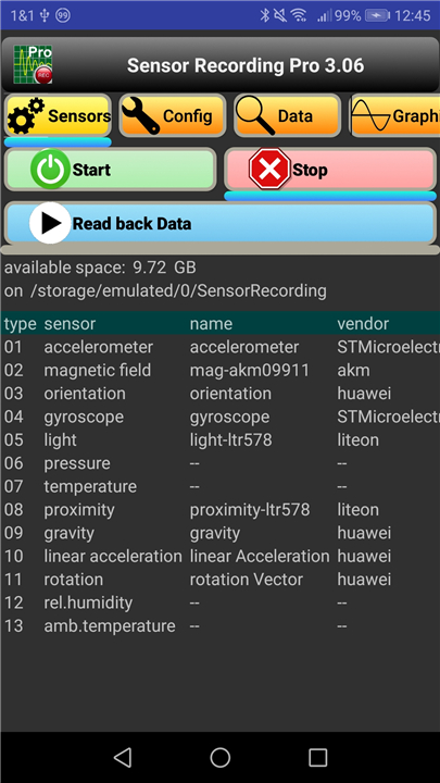 Sensor Recording Lite reads live measurement values and offers multiple ways to view them:
