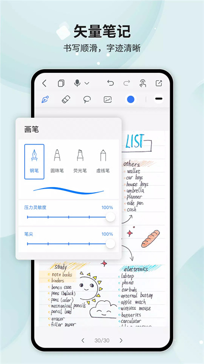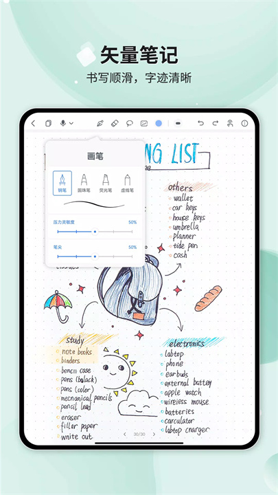 Huion Note为你提供各种画笔样式与颜色,让你在涂鸦和书写时更有乐趣!你可以轻松切换画笔,发挥无限创意,记录不一样的灵感。而且应用提供橡皮擦、套索工具和插入图片等功能,可以帮你精心排版,打造独具个性的精美手账!无论是生活中的小心情,还是工作中的重磅计划,Huion Note都能记录得完美无缺。