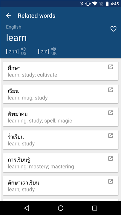 A: Yes! The app includes native audio pronunciations for both Thai and English words, with options for British and American English accents. Phonetic transcriptions are also provided.