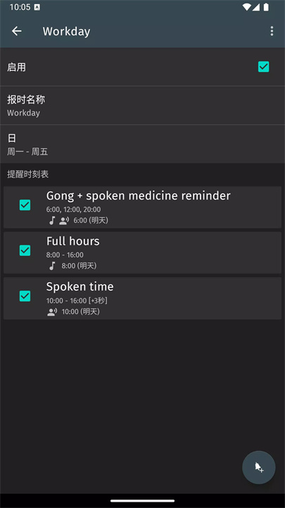 整点报时提供了广泛的自定义功能,用户可以选择任意小时或时间跨度进行提醒,并支持分钟选择(如整点、15、30、45分钟)。应用支持个性化设置铃声音量,不论是周一至周三的工作日提醒,还是休息时间的提醒间隔,都能灵活设置。