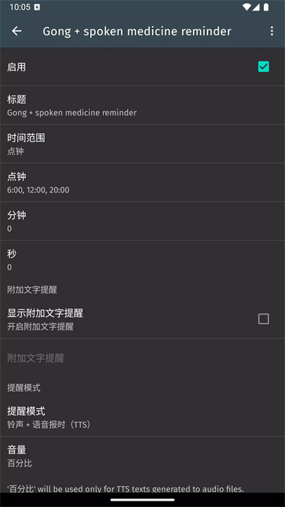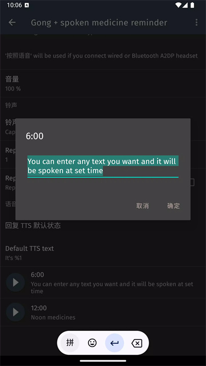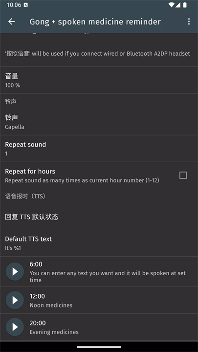 应用支持自定义的TTS(文本转语音)功能,用户可以输入任何内容,将其转换成语音提醒,便于设置关于药物、饮水等个人健康提醒的定时播报。
