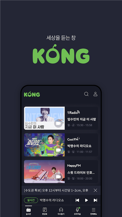 • KBS KONG offers an unparalleled mobile radio experience, bringing the comprehensive world of KBS radio directly to your smartphone.