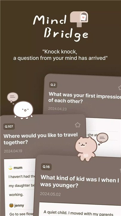MindBridge is an interactive and fun app designed to help you connect with yourself and your loved ones through daily heartfelt questions. Not only does it offer a unique way to engage, but it also lets you raise adorable virtual pets and decorate your space with accumulated resources.