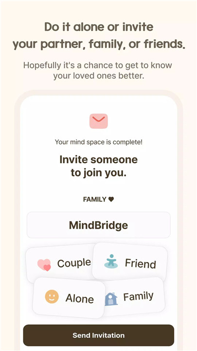 Yes! MindBridge offers modes for Couples, Family, Alone, and Friends. You can invite your loved ones to join and enjoy answering questions together. Each mode has curated questions to suit different group dynamics.