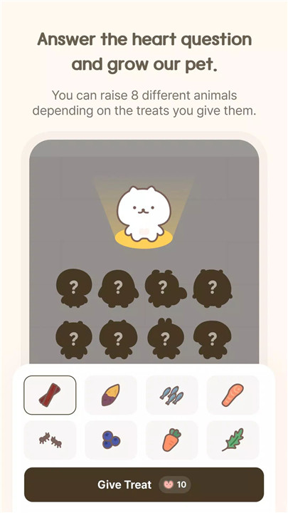 By answering questions, you earn experience points that help grow your virtual pet. Your pet evolves into one of eight animals based on the snacks you purchase using hearts, which you earn by engaging with the app.