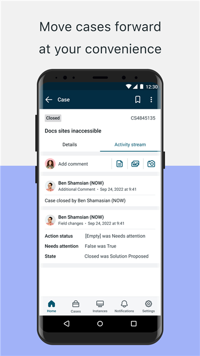 • By leveraging the power of the Now Platform®, the app ensures faster case resolution and efficient self-service—right from the palm of your hand.