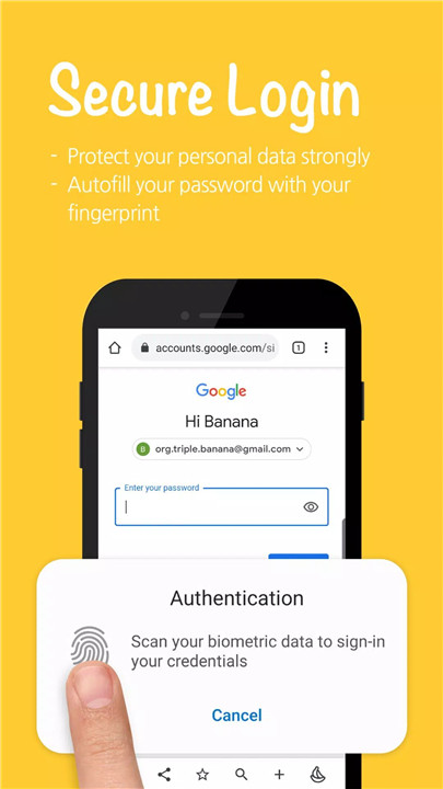 Forget the stress of remembering passwords! With Banana Browser's Secure Login feature, you can securely log in to your accounts using biometrics, such as your fingerprint, pattern, or PIN. Your account information is encrypted and never stored or sent to external servers.