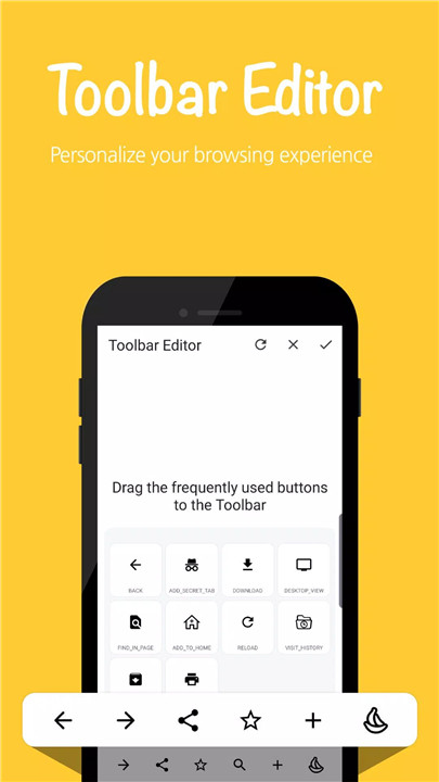 Customizing your browser’s interface has never been easier. Banana Browser’s Toolbar Editor lets you organize and place your favorite functions on the bottom toolbar.