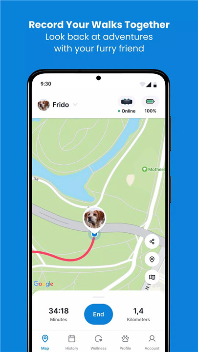 With the Walk feature, you can save and review your pet's daily walks. Whether it’s a short stroll around the block or an adventurous hike, Tractive records all the details, so you can look back and relive those moments.