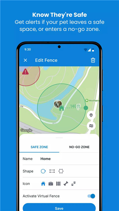 You can create Virtual Fences around safe areas like your backyard and set up No-Go Zones where you don’t want your pet to wander, like near busy roads. Whenever your pet enters or exits these zones, you’ll receive an alert. You can adjust and move these zones with ease.