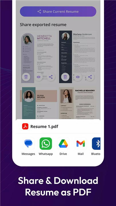 Once your resume is ready, you can share it across multiple platforms such as WhatsApp, Facebook, LinkedIn, iMessage, and Google Drive, or simply download it in PDF format.