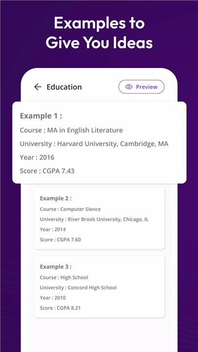Unsure about what to put in your resume? Don’t worry, the app also provides guides, including do and don'ts, and guidance for every section. Whether you're unsure about including certain information or need inspiration for industry-specific resumes (like Graphic Design, IT, Finance, and more), our app provides examples and tips to ensure your resume shines.