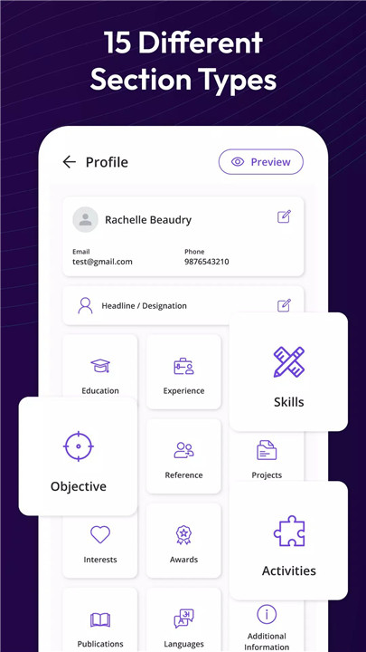 Personalize your resume effortlessly with our array of customization options. From interchangeable sections to unique section titles, 15 resume template colors, and varied font styles, tailor your resume to match your style and career goals seamlessly within the app.