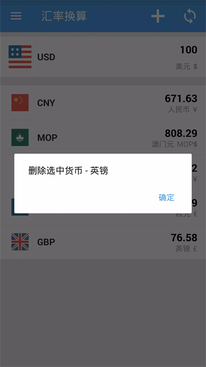 您可以通过点击应用界面的“+”按钮添加货币,长按货币项来删除不需要的货币。
