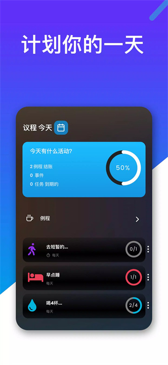 习惯追踪器也是应用的亮点之一,帮助用户保持良好的日常习惯,不管是锻炼、阅读还是其他个人目标,都可以通过该应用 的习惯追踪功能来监督进展,提高生产力。