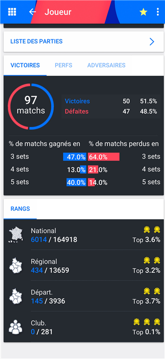 - Pourcentage de victoires en 3/4/5 sets (championnat par équipes)