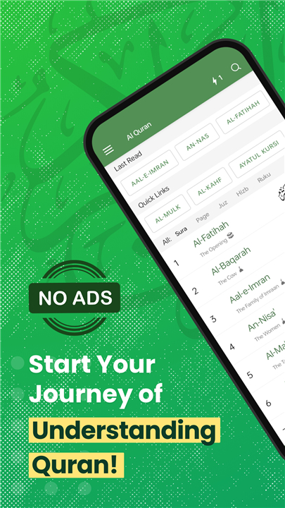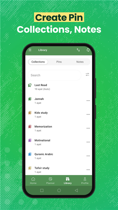 • Bookmark ayahs into custom collections and pin your last read for quick access.