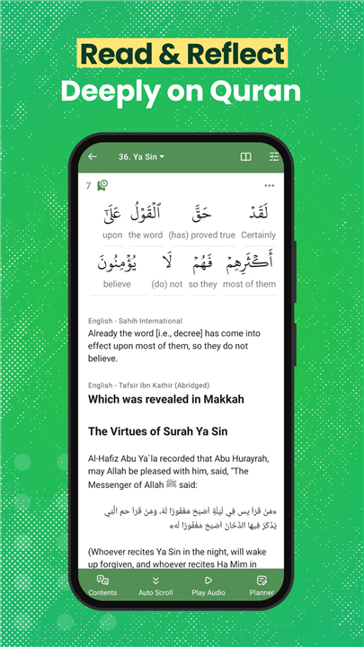 • The Al Quran app helps you reflect on the divine message through detailed Tafsir, word-by-word meanings, grammar, and beautiful recitations — all in your preferred language.