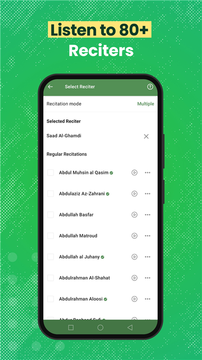 • Listen to recitations by 80+ renowned Qaris, including Mishary Al Afasy and Abdur Rahman As-Sudais.