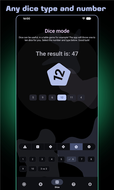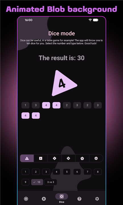 • Roll up to ten dice simultaneously, with full support for D4 through D20 and a dedicated 3v3 battle mode.