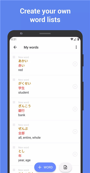 With Learn Japanese JLPT vocabulary, you have the ability to add your own words and categories, allowing you to focus on mastering the vocabulary that is most important to you. Create your own word banks and prioritize your learning objectives with ease.