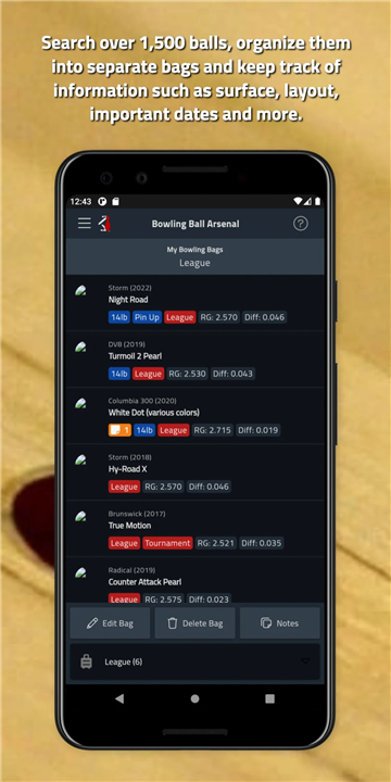 • Bowling Ball Arsenal – Manage your equipment, track specs, and search over 1,500 balls by brand, cover, core, and more.
