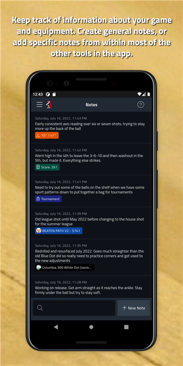 • Notes – Record game insights, equipment details, and performance data for future reference.
