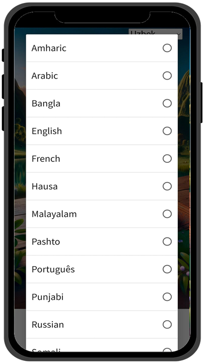 - Amharic, Arabic, Bangla, English, French, Hausa, Malayalam, Pashto