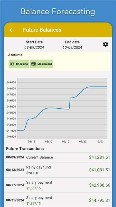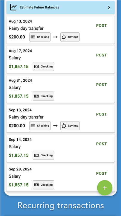 A: Within the app you can create entries for recurring bills, specify due dates, and indicate payment amounts. ClearCheckbook then highlights upcoming bills in your account view and can remind you via email or push notification. That way you’re never caught off guard by a forgotten utility or subscription fee, and you avoid extra charges or negative marks on your credit.
