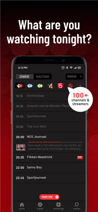 Get real-time info about what’s airing on over 100 TV channels, including popular Dutch networks like ESPN, BBC First, Ziggo Sport, NPO, RTL, and more.
